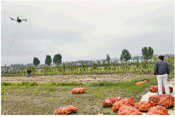 二荣楼村的“空中运输”并非个例。这场“救援”行动的起源,要追溯到10月4日一位老人的求助。“那天有位老人来问能不能用无人机运玉米,我们的无人机原本是用来打农药的,谁也没试过运粮食。”金乡县鸡黍镇京信为农服务中心员工赵晨回忆说。为解农户燃眉之急,中心次日便在赵马庄村紧急实验,“用10多米的绳子加挂钩改装后,不下雨时一次能运一袋,全程不到2分钟。”这次成功尝试,让“空中搬运工”模式正式落地。74岁的前盐村农户胡玉江是受益者之一。“多亏有这无人机,要不然我这么大岁数真扛不过来。”他种的7亩玉米,9日一天就全部收完,言语间眼中闪烁着光亮。